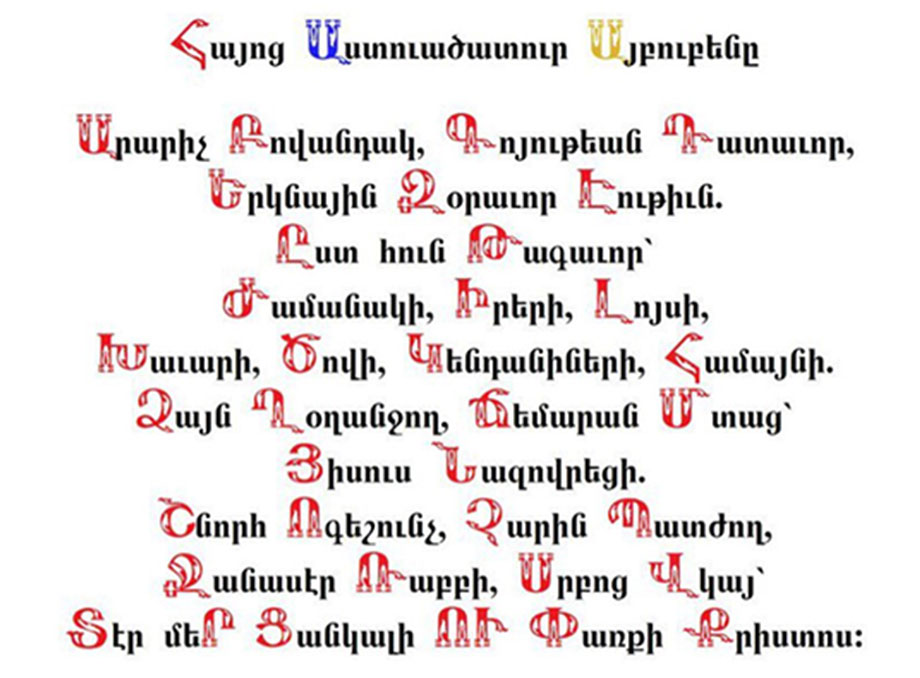 Հայոց այբուբենը աղոթք է. Յուրաքանչյուր տառ նշանակում է մեկ բառ: Մեսրոպ Մաշտոցի ստեղծած հերթականությամբ կարող ես աղոթք կարդալ։