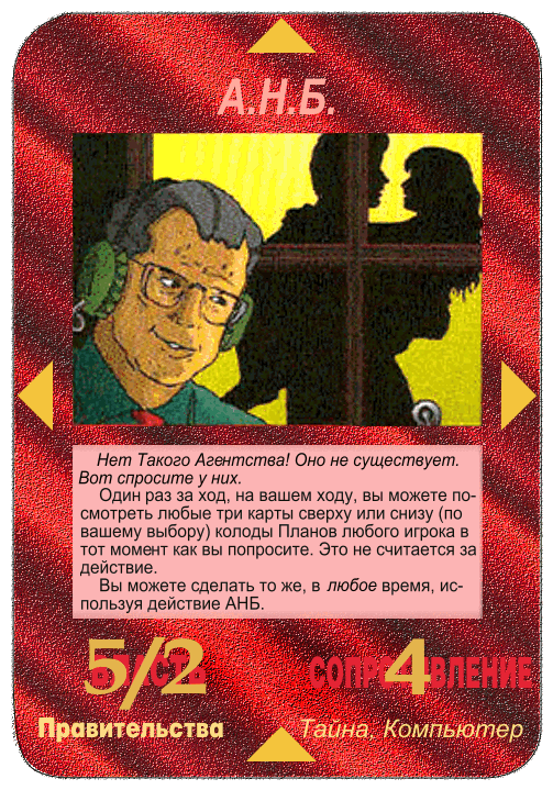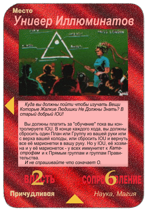 Один раз за ход. на вашем ходу, вы можете посмотреть любые три карты сверху или снизу (по вашему выбору) колоды Планов любого игрока в тот момент как вы попросите. Это не считается за действие.