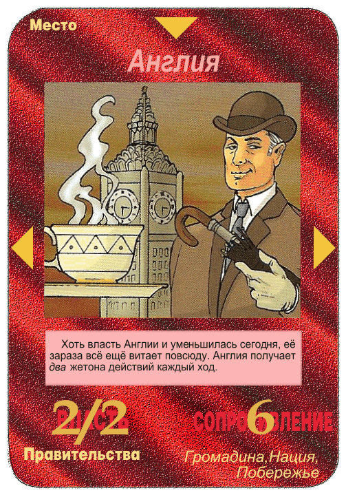 Хоть власть Англии и уменьшилась сегодня, её зараза всё ещё витает повсюду. Англия получает два жетона действий каждый ход.
