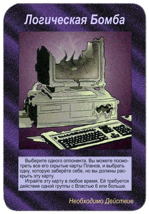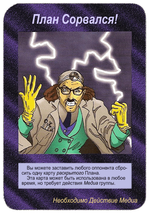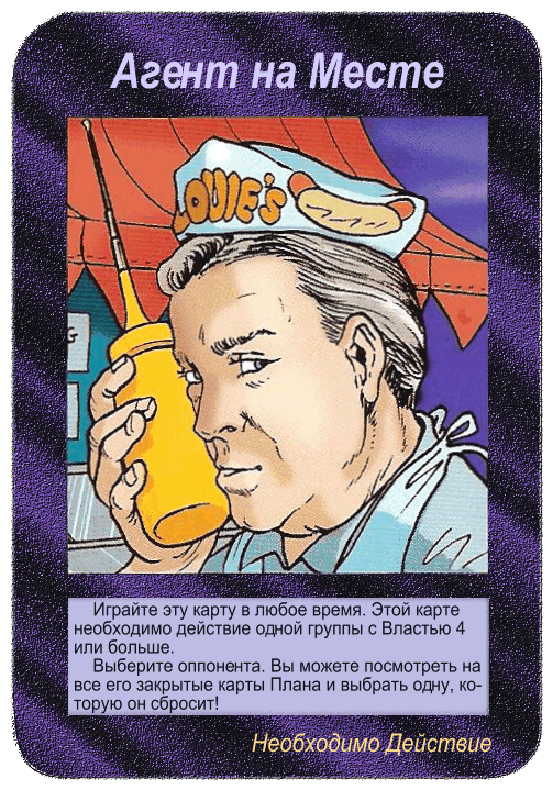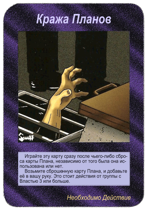 Эта карта может быть разыграна в любое время. Выбирите одного противника в качестве цели. Вы можете посмотреть все его скрытие карты Планов, и либо украсть одну из них, либо раскрыть их все!