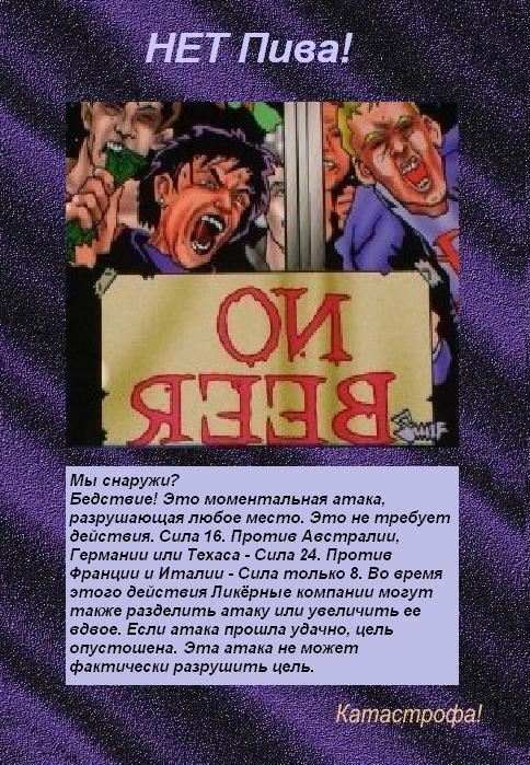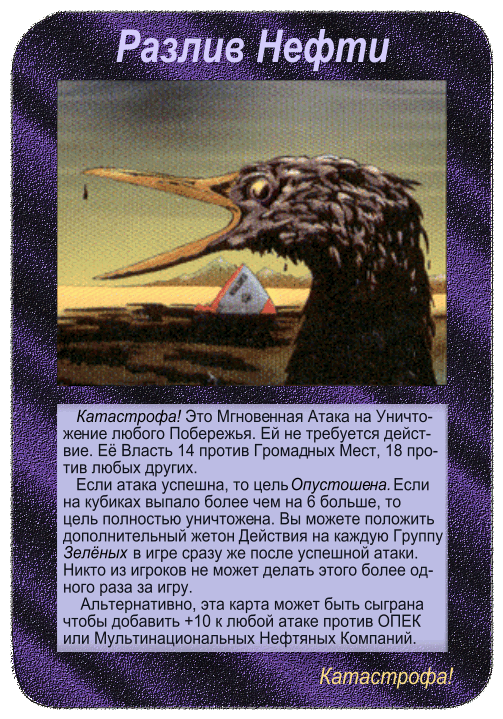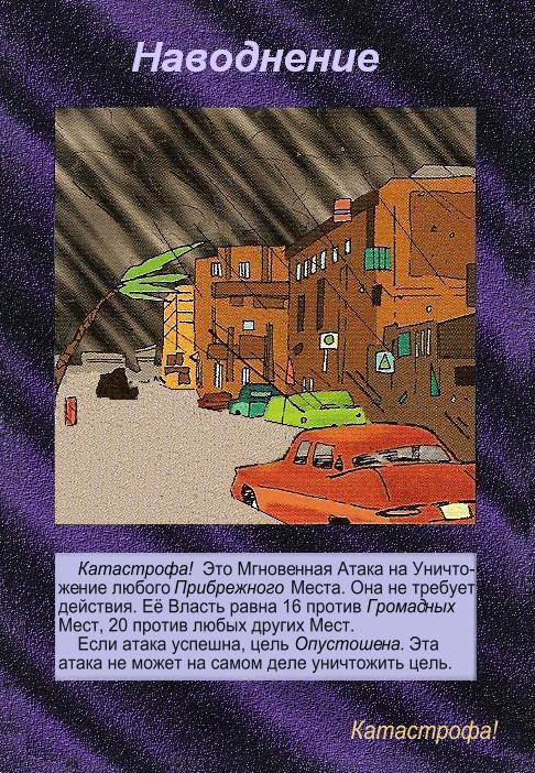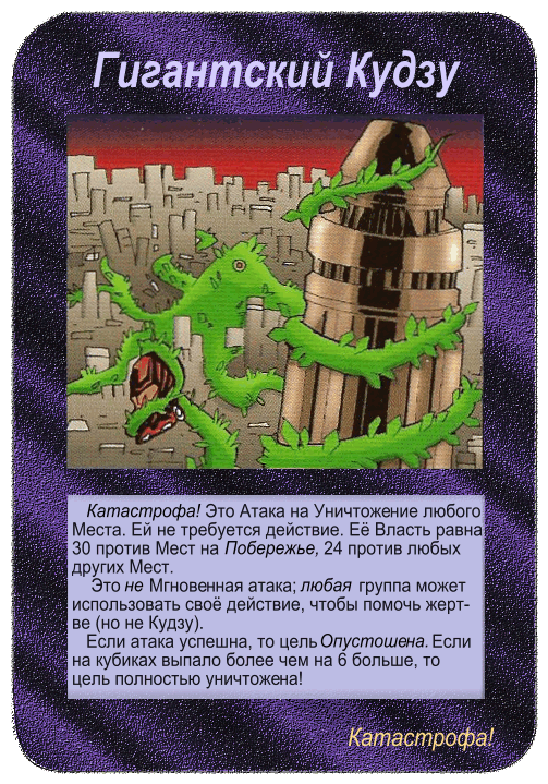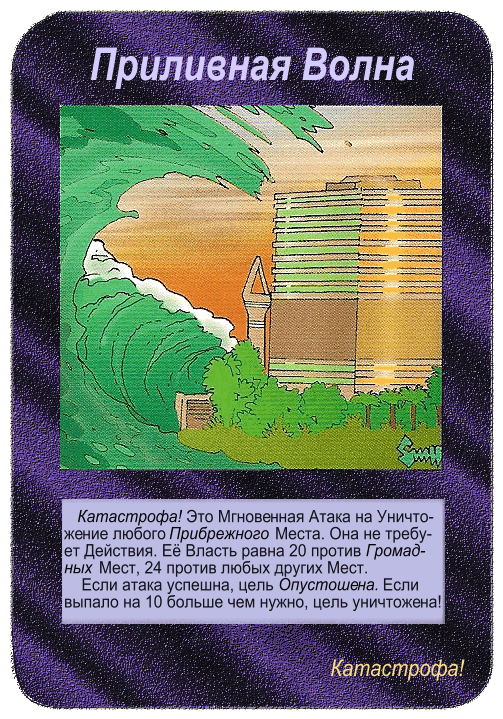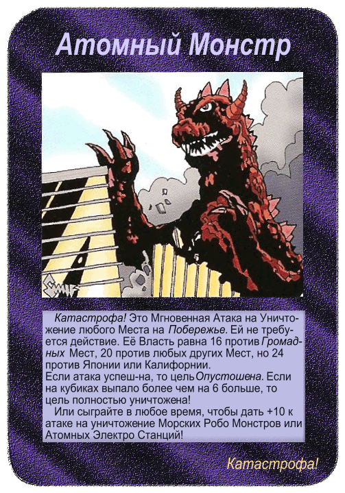 Катастрофа! Это Мгновенная Атака на Уничтожение любого Места на Побережье. Ей не требуется действие. Её Власть равна 16 против Громадных Мест, 20 против любых других Мест, но 24 против Японии или Калифорнии.         Если атака успеш-на, то цель Опустошена. Если на кубиках выпало более чем на 6 больше, то цель полностью уничтожена!                                                            Или сыграйте в любое время, чтобы дать + 10 к атаке на уничтожение Морских Робо Монстров или Атомных Электро Станций!