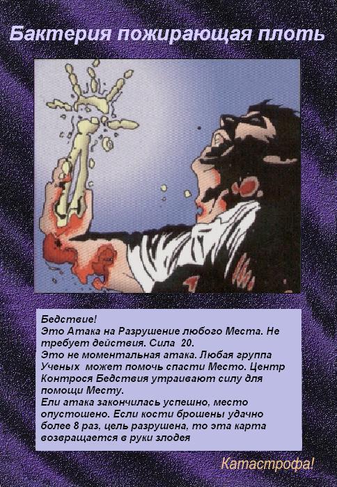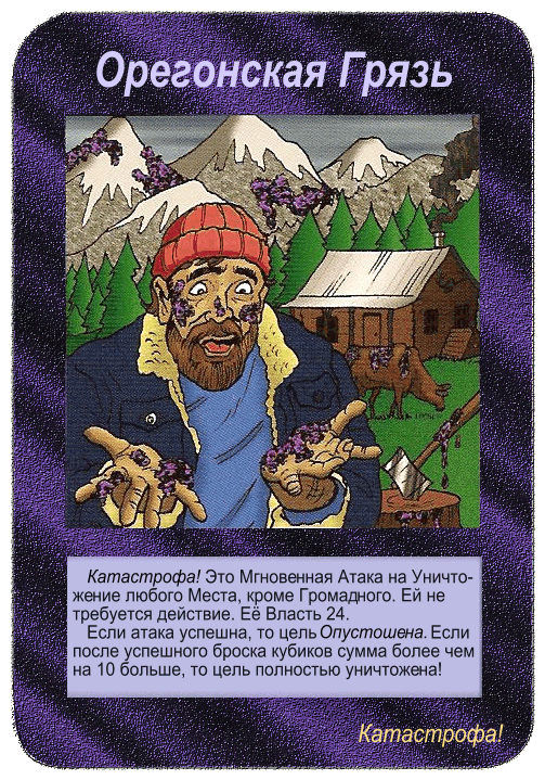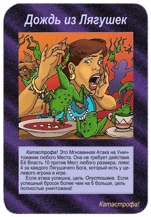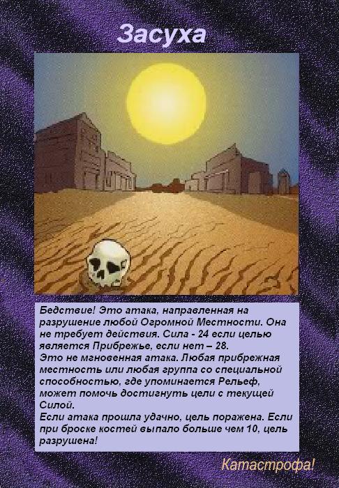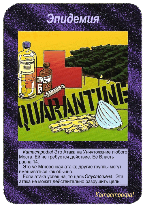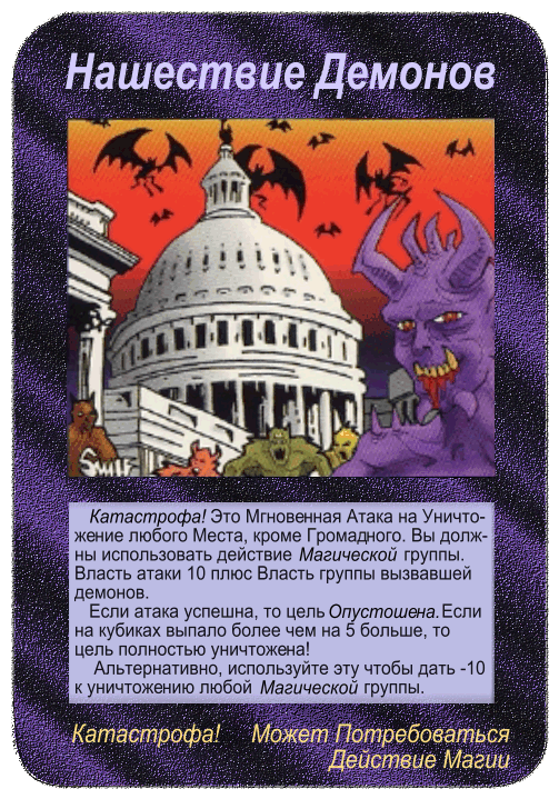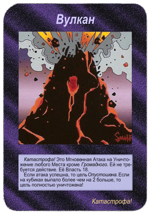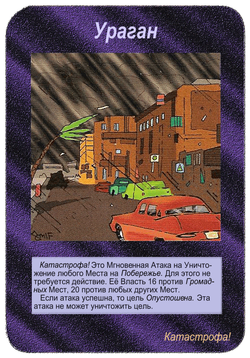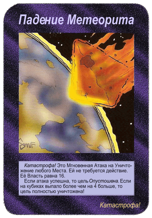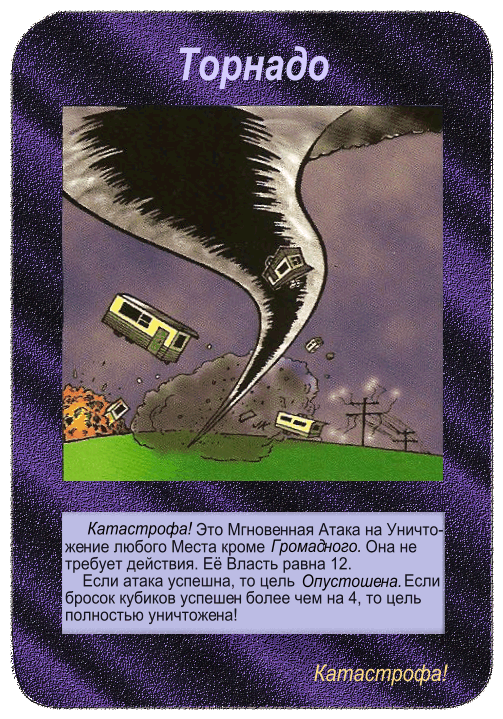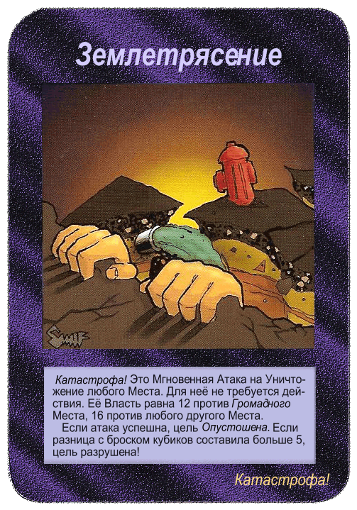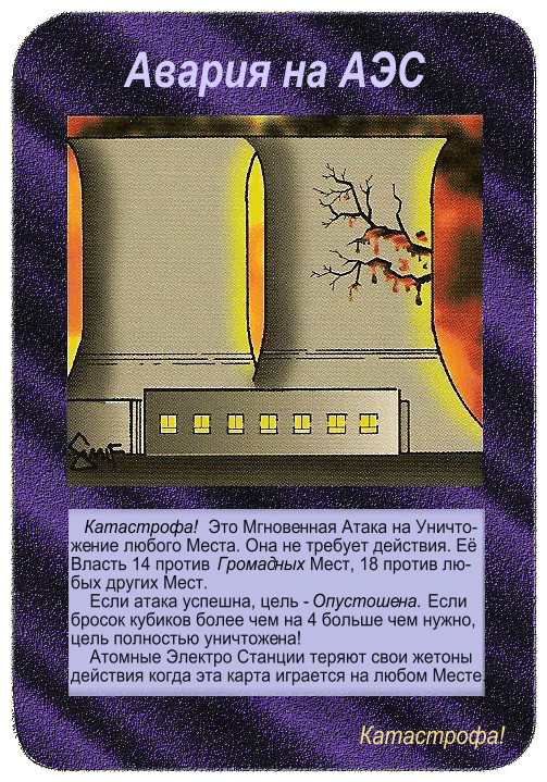 Катастрофа! Это Мгновенная Атака на Уничтожение любого Места. она не требует действия. Её Власть 14 против Громадных Мест, 18 против любых других Мест.                                                                                                                   Если атака успешна, цель-Опустошена. Если бросок кубиков более чем на 4 больше чем нужно, цель полностью уничтожена!                                                       Атомные Электро Станции теряют свои жетоны действия когда это карта играется на любом месте.