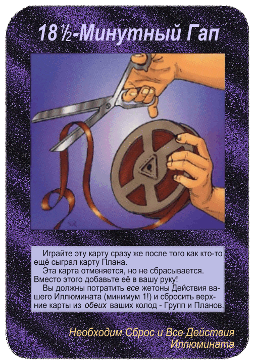 Вы должны потратить все жетоны Действия вашего Иллюмината (минимум 1!) и сбросить верхние карты из обеих ваших колод - Групп и Планов.