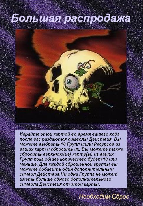 Играйте этой картой во время вашего хода, после вас раздаются символы Действия. Вы можете выбрать 10 Групп и/или Ресурсов из ваших карт и сбросить их. Вы можете также ваших карт и сбросить верхнюю(ие) карту(ы) из ваших Групп пока общее количество будет 10 или меньше. Для каждой сброшенной группы вы можете добавить один дополнительный символ Действия. Ни одна Группа не может иметь больше одного дополнительного символа Действия от этой карты.
