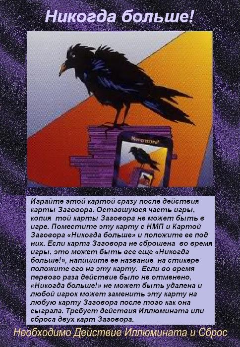 Играйте этой картой сразу после действия карты Заговора. Оставшуюся часть игры, копия той карты Заговора не может быть в игре. Поместите эту карту с НМП и Картой Заговора "Никогда больше" и положите ее под них. Если карта Заговора не сброшена во время игры, это может быть все еще "Никогда больше!", напишите ее название на стикере положите его на эту карту. Если во время первого раза действие было не отменено, "Никогда больше!" не может быть удалена и любой игрок может заменить эту карту на любую карту Заговора после того как она сыграла.