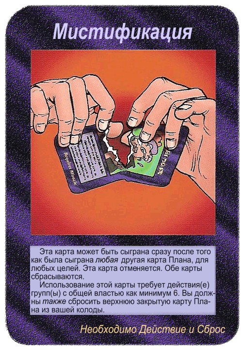 Разыгрывайте эту карту вместе с картой Плана, которой нужно действие(я). Эта карта заменяет любое одно действие Властью 6 или меньше из любой Направленности или Аттрибута, кроме действия Иллюмината. Однако, вы должны сбросить верхнюю карту из своей колоды карт Планов.