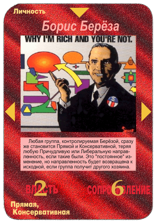 Любая группа, контролируемая Берёзой, сразу же становится Прямой и Консервативной, теряя любую Причудливую или Либеральную направленность, если такие были. Это "постоянное" изменение, но направленность будет возвращена к исходной, если группа получит другого хозяина.