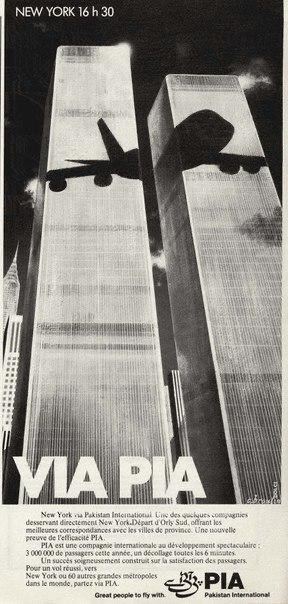 Реклама пакистанских авиалиний на фоне башен близнецов, 1979 год