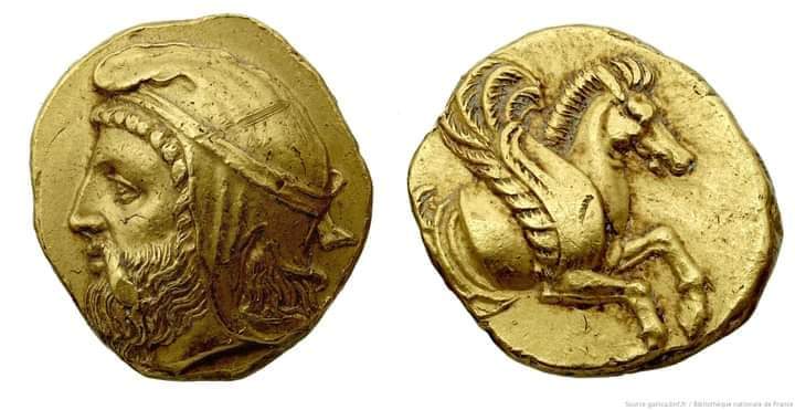 Золотая монета с изображением царя Ерванда I из армянской династии Оронтидов (Ервандуни). Эта монета датирована 362 г. до н.э. и выставлена в Национальной библиотеке Парижа, Франция.