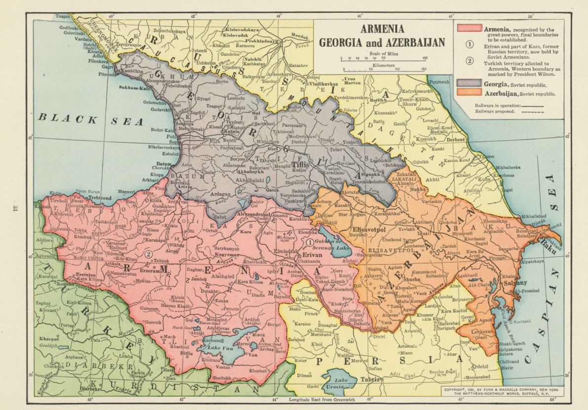 Американская карта 1921 года показывающая западную границу Армении с Турцией по Севрскому договору, установленную арбитражем президента Вудро Вильсона. Первоначальные границы и спорные территории Советских республик Закавказья, установленные после Московского договора.