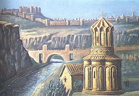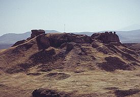 At the southern end of Ani the ground rises up to form a flat-topped hill. This part of Ani is known as the "Inner Fortress" (Midjnaberd in Armenian), or simply as the "citadel". As well as having natural defences of steep cliffs on three sides, the citadel was encircled by a single line of ramparts. This wall had towers on its north facing section, and an entrance gateway at its north-western corner.