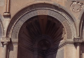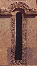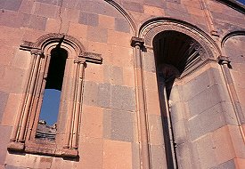 Like most Armenian buildings, the cathedral is built entirely from stone - a facing of extremely well cut and finished polychrome masonry hides a rubble concrete core. The plan is in the form of a domed basilica. This is a pattern found in Armenia since the seventh century. However, Trdat's design takes this old form to new heights of sophistication and originality.