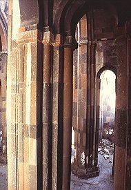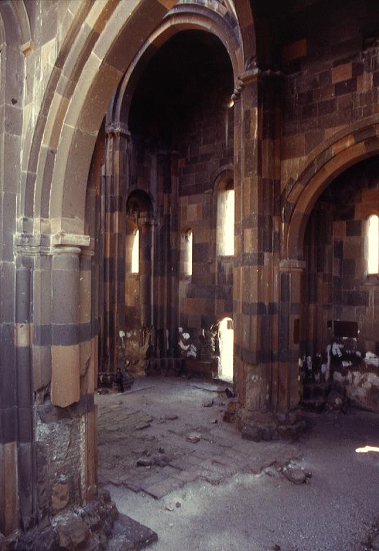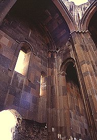 Huge gaps in the interior masonry probably indicate the former position of khatchkars - hacked out when the building was converted to a mosque, or by later treasure hunters. Armenian inscriptions have in recent years been deliberately hidden by coverings of paint designed to match the stonework. This (together with bird droppings) defaces much of the fine interior masonry.