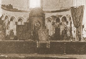 The spacious apse is accommodated beneath the easterly roof and revealed on the outside facade only in the form of a window between two deep niches. The chancel within the apse is elevated from the rest of the floor and has a row of ten semicircular niches containing seats. It is flanked by two-storied chambers whose upper floors are reached by narrow stairs accessed from within the chancel.