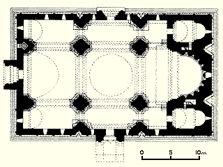 Since the apse and side-chambers account for about a quarter of the interior space, the vaults east of the dome are short, considerably shorter than those west of the dome. Four massive clustered piers in the rectangular nave support both the dome and the arches supporting the roof. The barrel vaults along the east-west and north-south axes are almost as high as the base of the drum, and are expressed outside in the two intersecting pitched roofs.