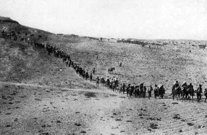 In 1922-1923 Near East Relief evacuated 22.000 children from orphanages in interior Turkey to Syria and Greece This picture shows part of the 5.000 children from Kharput en route on donkey back and foot.