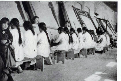 Armenian children weaving rugs in the American Committee shops at Erivan