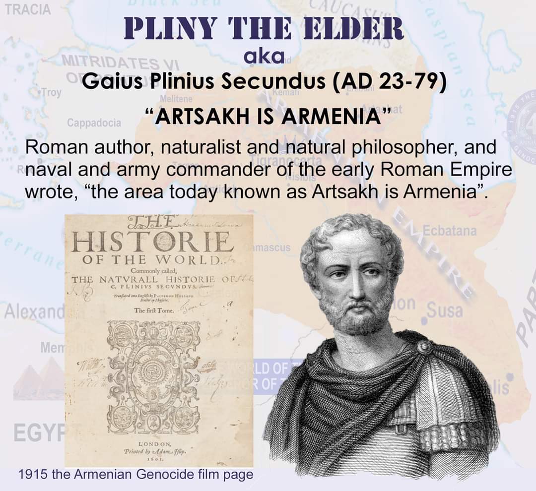 How many times we've heard the baseless, paid for by Azerbaijan's Oil money, nomenclature Artsakh, the "Internationally Recognized Territory of Azerbaijan". However, for those that keep yelling this falsehood at the top of their lungs, Roman philosopher, Pliny the Elder, has something to say about that when he wrote 19 centuries ago, Artsakh is Armenia. Then again those who subscribe to falsehood, never heard of Pliny or his book, History of the World...