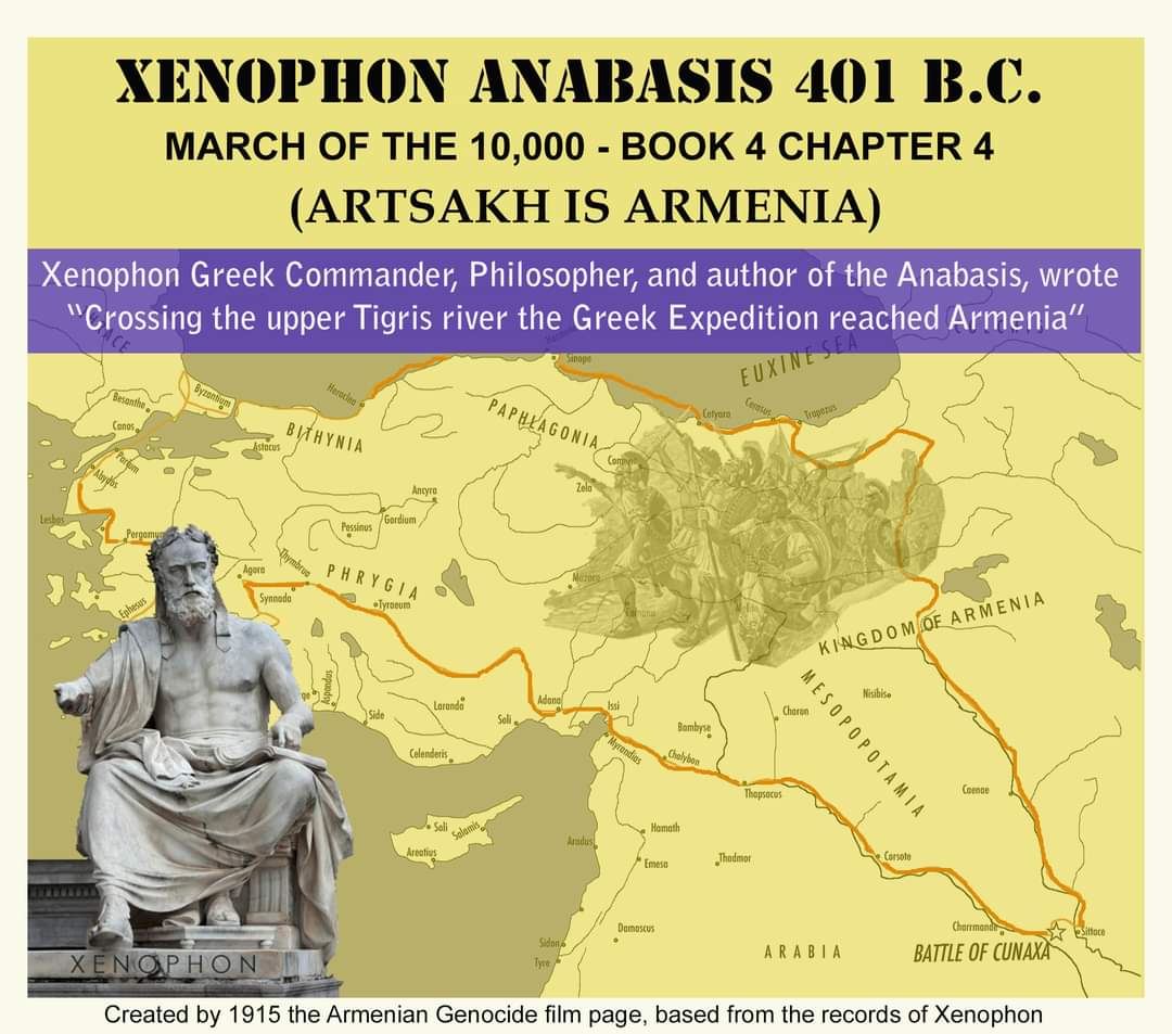 Artsakh is Armenia, so says Greek military commander and Historian, Xenophon 2400 years ago in one of the greatest military facts based Books, the Anabasis. Why? Because History is the Greatest Enemy of Turkey and Azerbaijan. In the Anabasis, Book 4, Xenophon describes the Armenians as friendly to the Greeks retreating from Persia. In fact, Xenophon wrote Armenia provided supplies and food to help the Greek expeditionary force reach home. Where were you Turks and Azerbaijanis 2400 years ago?